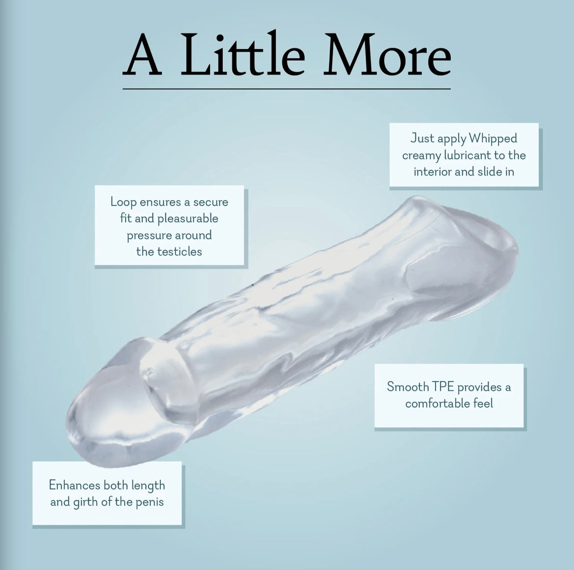 Looking for A Little More? Enhance your bedroom escapades with this 7.5" (19 cm) penis extender. Made of super soft TPE, A Little More adds both length and girth to your partner to help take things to the next level. Just apply some creamy lubricant to the interior of the toy and slide in, pulling the loop behind the testicles to keep the extender in place. After that, apply any lubricant to the exterior of the extender…and enjoy.
