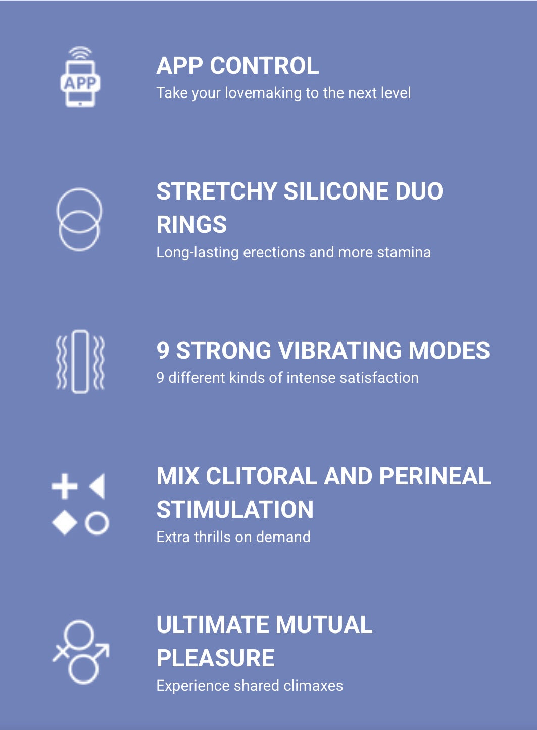 For best use, apply plenty of water-based lube to help the ring slide onto the flaccid member. It’ll hold the blood flow in place, making your erection firmer and delaying ejaculation. You’ll both delight in the increased hardness and intensity, allowing you to savor more pleasure throughout the night! Choose from 9 vibration settings to make you both moan, and it’s all easily managed with the button on top or one tap inside the app!