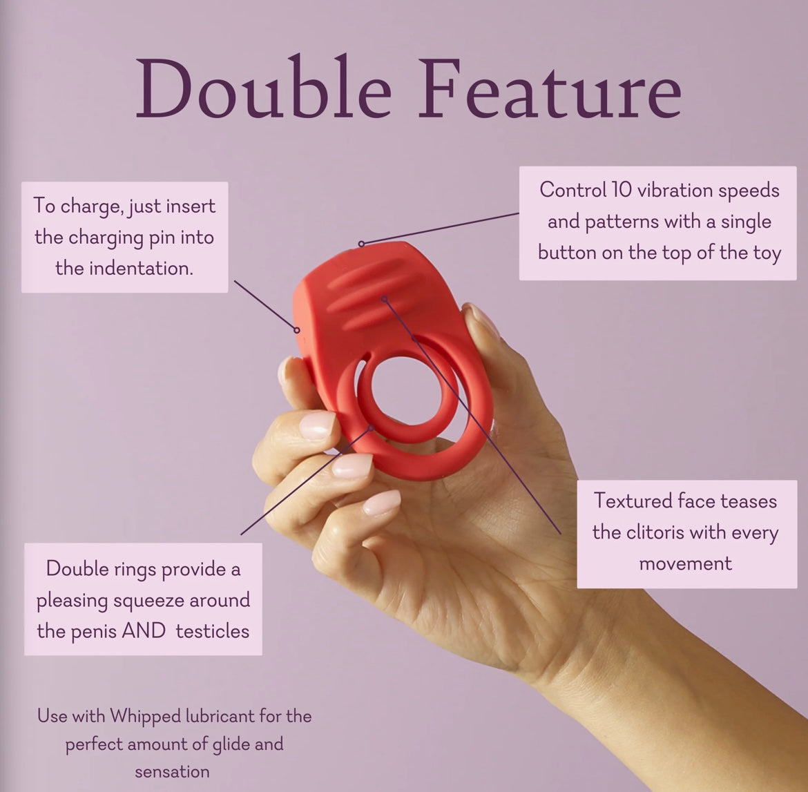 Get an incredible performance with Double Feature, our most popular c-ring. Flexible dual rings offer pleasurable pressure for your partner while the 10-function clitoral massager vibrates in 10 functions for your pleasure. Slip one silicone ring over the shaft and the other over the testicles, then angle the ridged massager toward your clitoris for satisfying sensations times two.