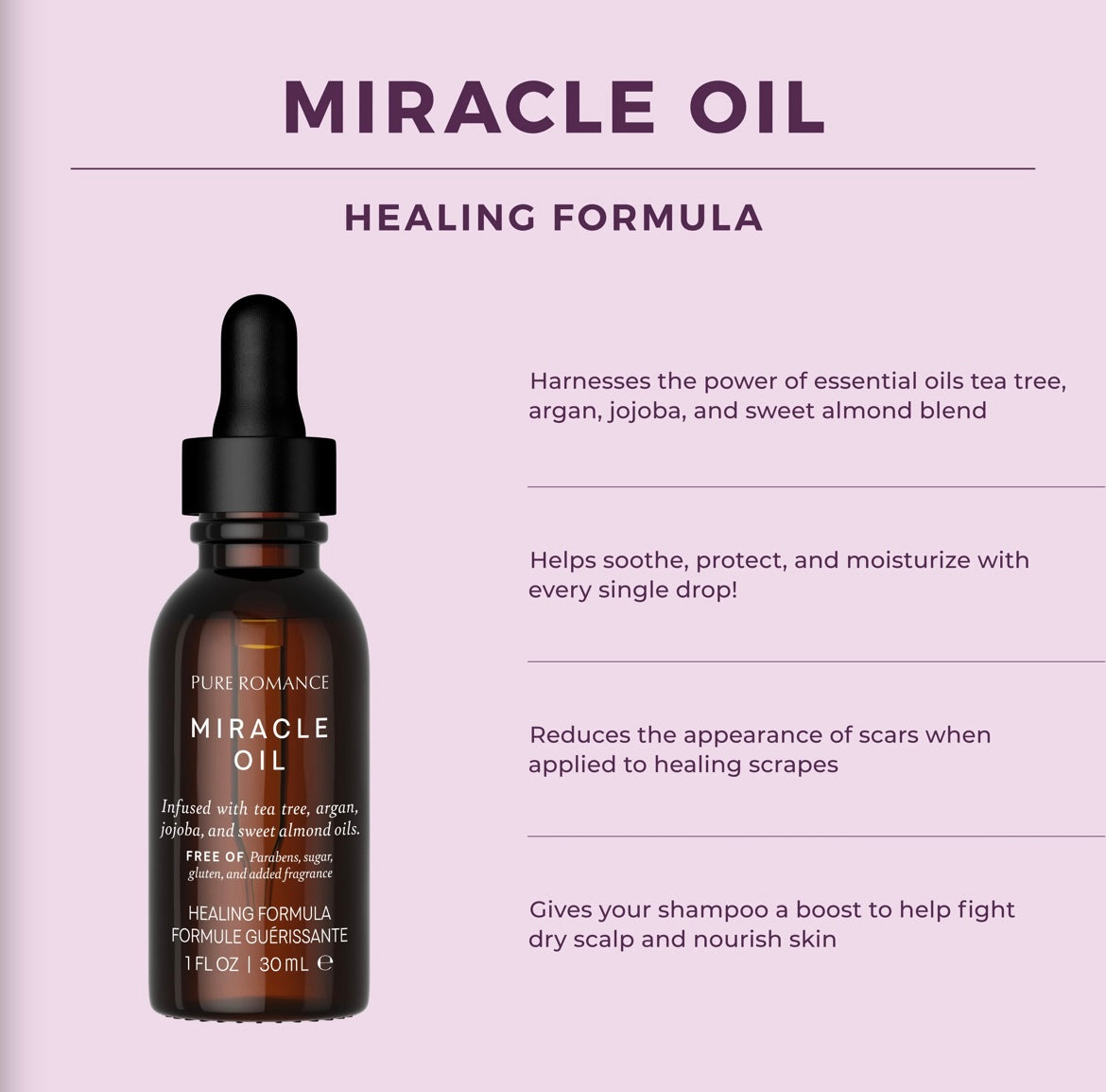 Harness the power of pure essential oils with our versatile formula that helps soothe, protect, and moisturize with every single drop. Miracle Oil is infused with tea tree oil as well as hydrating argan, jojoba, and sweet almond oils. This multipurpose formula can be applied to scrapes to help reduce the appearance of scars. Apply directly to your skin or mix a dropper full into your facial moisturizer or shampoo to fight the signs of aging or help with dry scalp.
