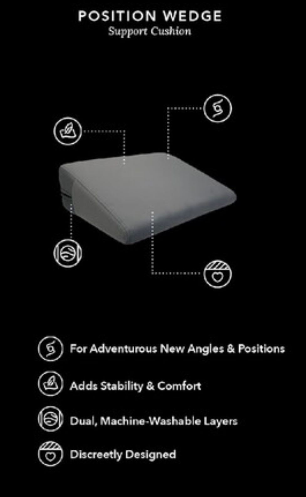 This wedge-shaped pillow is perfect for elevating the hips during intimacy allowing for comfort in all your favorite positions, old and new. The sturdy foam pad and soft, machine-washable cover provide a comfortable cushion and it’s discreet, low-profile design allow it to easily disappear from any prying eyes.