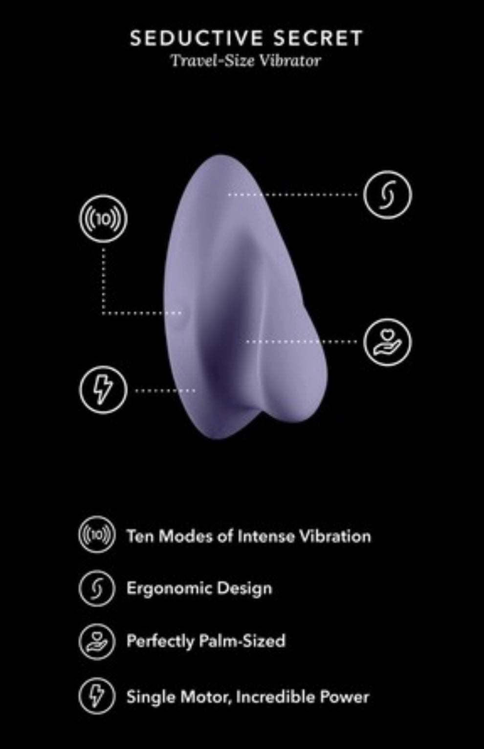 • Includes: Seductive Secret Travel-size Vibrator, Directions Card, USB Charging Cord