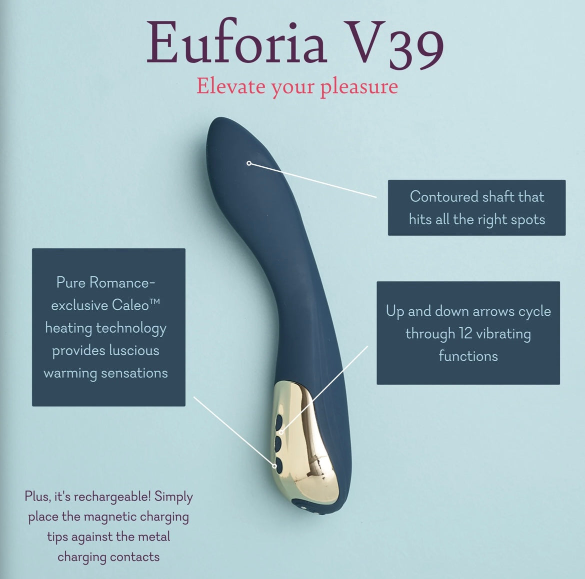 Experience premium, heated pleasure with the Euforia V39 Vaginal Vibrator. Just like the rest of our Euforia Products, the V39 delivers the best in quality and features. The perfectly contoured shaft is coated in silky soft silicone, while the beautiful 18-karat gold plate brings you to a new level of luxurious bliss. Enjoy three breathtaking speeds and nine pulsing patterns. And when you’re ready to turn up the heat, Caleo™ technology delivers tantalizing warmth. Enjoy in the bedroom or the bath for an exceptional pleasure experience.